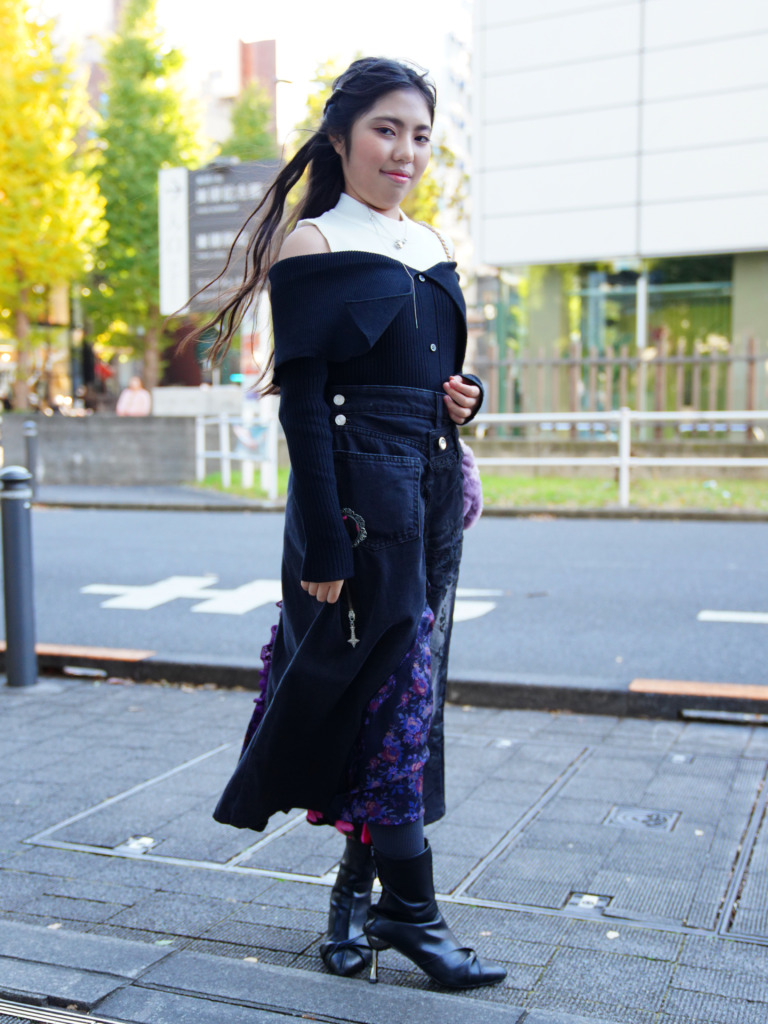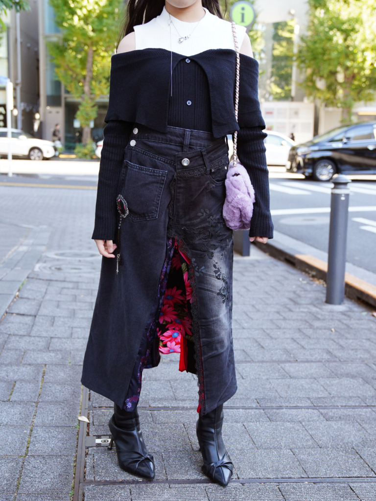 12歳(小学6年生)。大人顔負けの個性派モードエレガントコーデに挑戦。世界のトレンド、SDGs時代のサステナビリティ概念を取り入れたスタイリッシュファッション。リユースのブラックデニムとスカーフでリメイクされたスカートは、世界にひとつだけの個性を演出。若い世代から発信するSDGsファッションです。